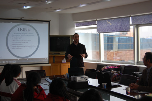 3月27日下午,美国大学国际教育联盟(USCIE)代表来我校访问。教育联盟(USCIE)包括贝尼迪克坦学院(Benedictine College),伊凡斯维尔大学(University of Evansville),密苏里大学-圣路易斯(University of Missouri-St. Louis),圣路易斯大学(Saint Louis University- Main Campus),怀恩大学(Trine University)和美国威斯敏斯特学院(Westminster College)。