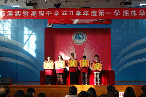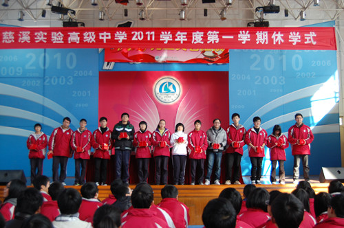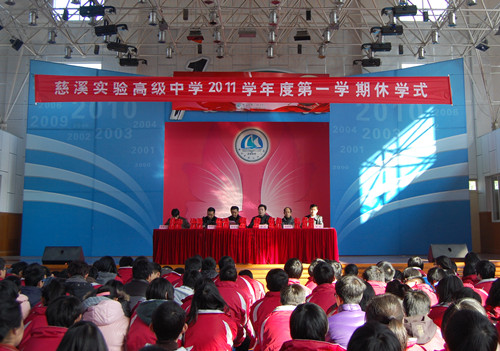 慈溪实验高级中学2011学年度第一学期休学式于1月17日在学校体育馆隆重举行。学校行政、各处室领导出席仪式。仪式由郑佳义副校长主持。