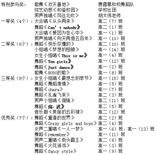 本次汇演的节目形式多样,有独唱、合唱、舞蹈、歌舞、音乐剧等。舞蹈《Can’t nobody》、《快乐你懂的》、《Ten girls》、《舞蹈激情》、《孔雀飞来》等舞出了年轻学子的青春和活力,合唱《从头再来》、《爱因为在心中》等唱出了同学们的豪迈气势和坚定的决心,由教职工代表带来的助兴节目男声独唱《风往北吹》更是把晚会推向了高潮。精彩纷呈的表演让师生陶醉其中,意犹未尽。