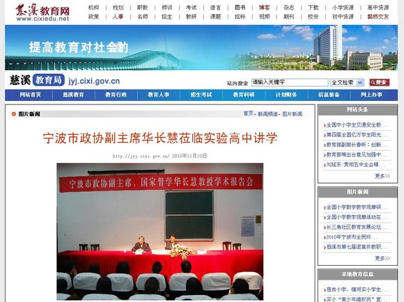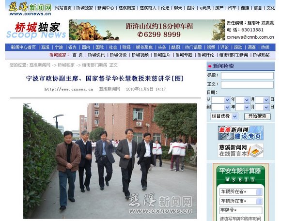 11月8日,宁波市政协副主席、国家督学华长慧教授在慈溪市人大常委会副主任王志成、慈溪市政协副主席徐尔元的陪同下莅临实验高中考察指导,并于当晚为实验高中、实验中学两校教师作“关于提升教育内涵的几个问题”的专题学术报告。报告会由学校常务副董事长孙春涛老师主持,慈溪市教育局张幸华副局长与老师们一起聆听了报告。 《慈溪新闻网》追踪报导: 《慈溪教育网》追踪报导: