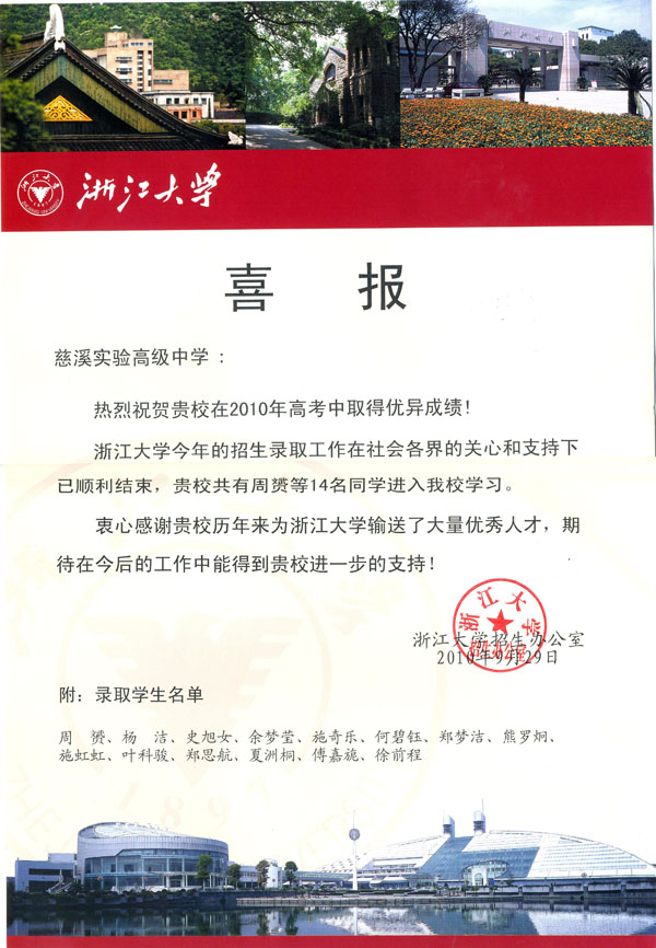 喜报—浙江大学祝贺我校在2010年高考中取得优异成绩