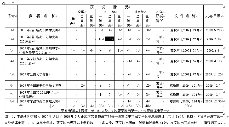 2、浙江省高中化学竞赛16人获省一等奖(宁波市共35人),占全宁波市的46%。
